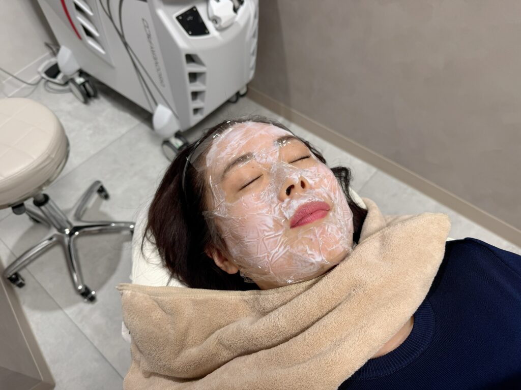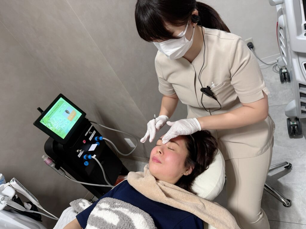 目元ギリギリまで施術できて、目まわりのたるみにもアプローチできるとのこと。おでこ、こめかみ、鼻の脇、首まで丁寧に打っていきます。少しチクチクするくらいで、痛みが苦手な私でも余裕で受けられました。施術中、眠ってしまう患者さんもいるそう。