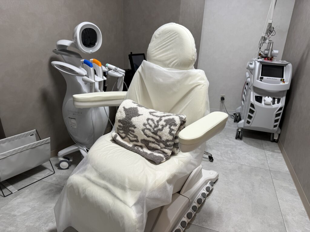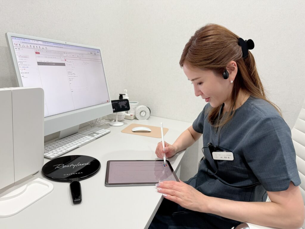 次に、先生の診察を受けます。「先生が行う手打ちの肌育注射の技術がすごい」、とかなり評判が良いので、私も注射にしようか迷いました。ただ、「手打ちだとやはり痛いので、髪の毛より細い針を使用したデバイス、サーマニードルがおすすめ」と提案をいただき、注射は次回挑戦することに。