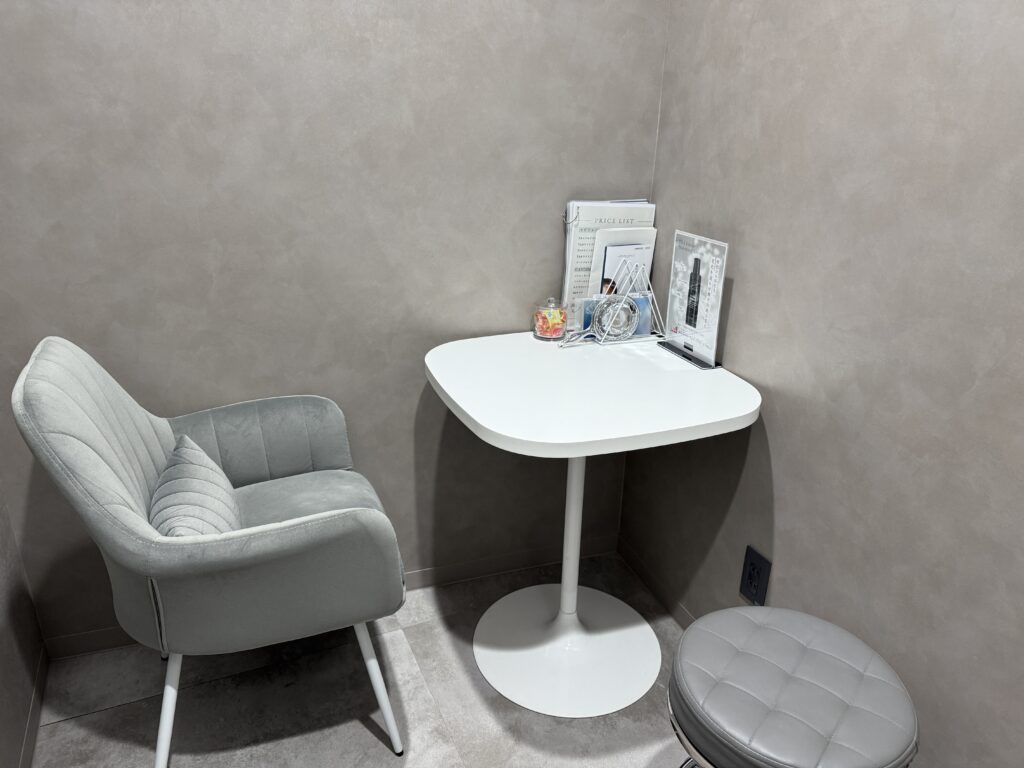 同じくグレーの色調のカウンセリングルームも、プライベートな空間が確保されています。こちらで、まずはカウンセラーさんと肌悩みや希望の施術を相談します。