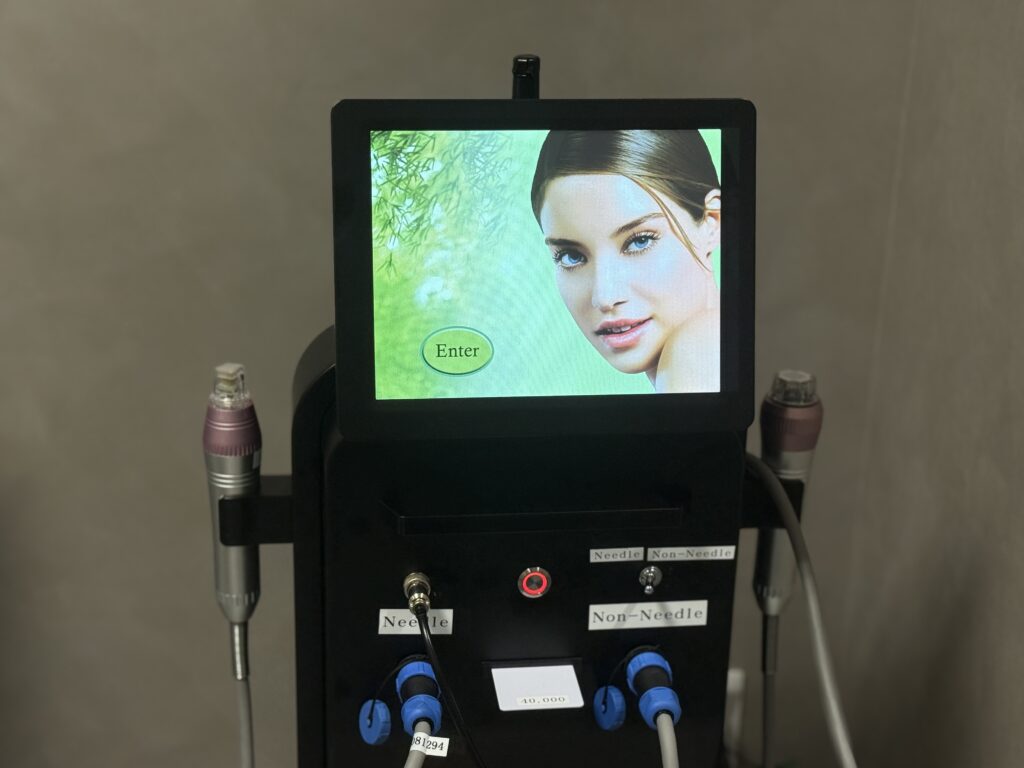 こちらが、今回受けるサーマニードルの機械。マイクロニードルとRF(ラジオ波)を組み合わせた革新的な治療で、極細の針(マイクロニードル)を皮膚に浅く挿入し、そこからRFエネルギーを真皮層に送ります。