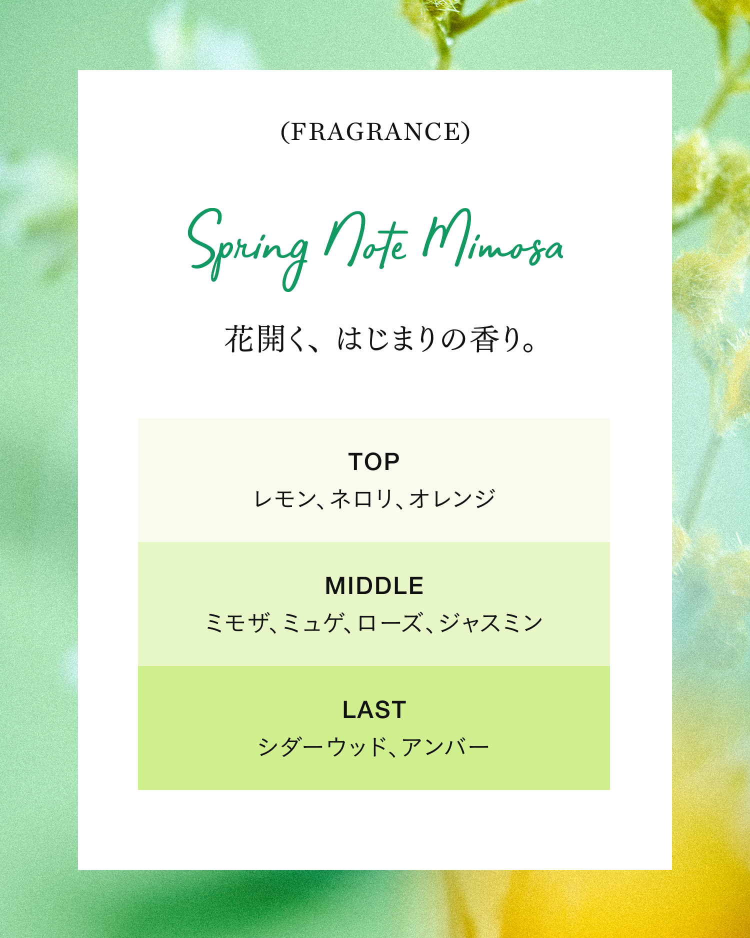 スプリングノートミモザのフレグランスは、香水発想の「SEE/SAW」オリジナルの複雑で奥深い香りを活かしながら女性たちの新たな一歩を後押ししてくれるような軽やかさをプラス。