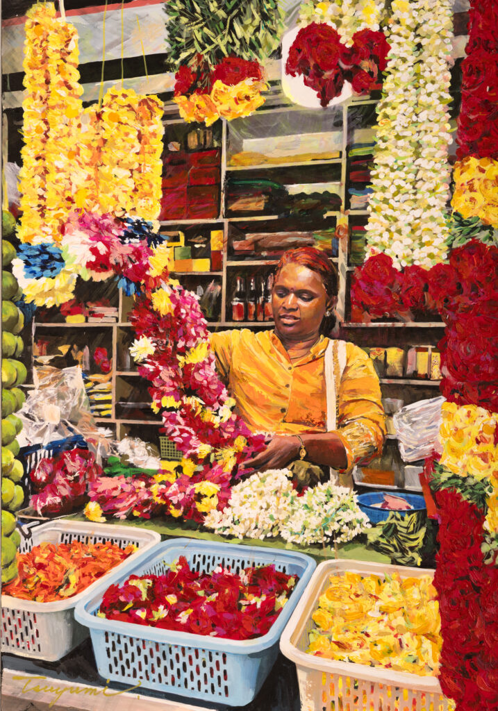 つゆ美さんが描いた女性・ポンナ(Ponna)は、リトル・インディアで30年以上にわたり、花輪を編み続けてきた職人です。朝、まだ暗いうちに市場に出かけ、最も新鮮で香り高い花を選び、指先に集中を宿しながら一本一本を糸で通していく——。
