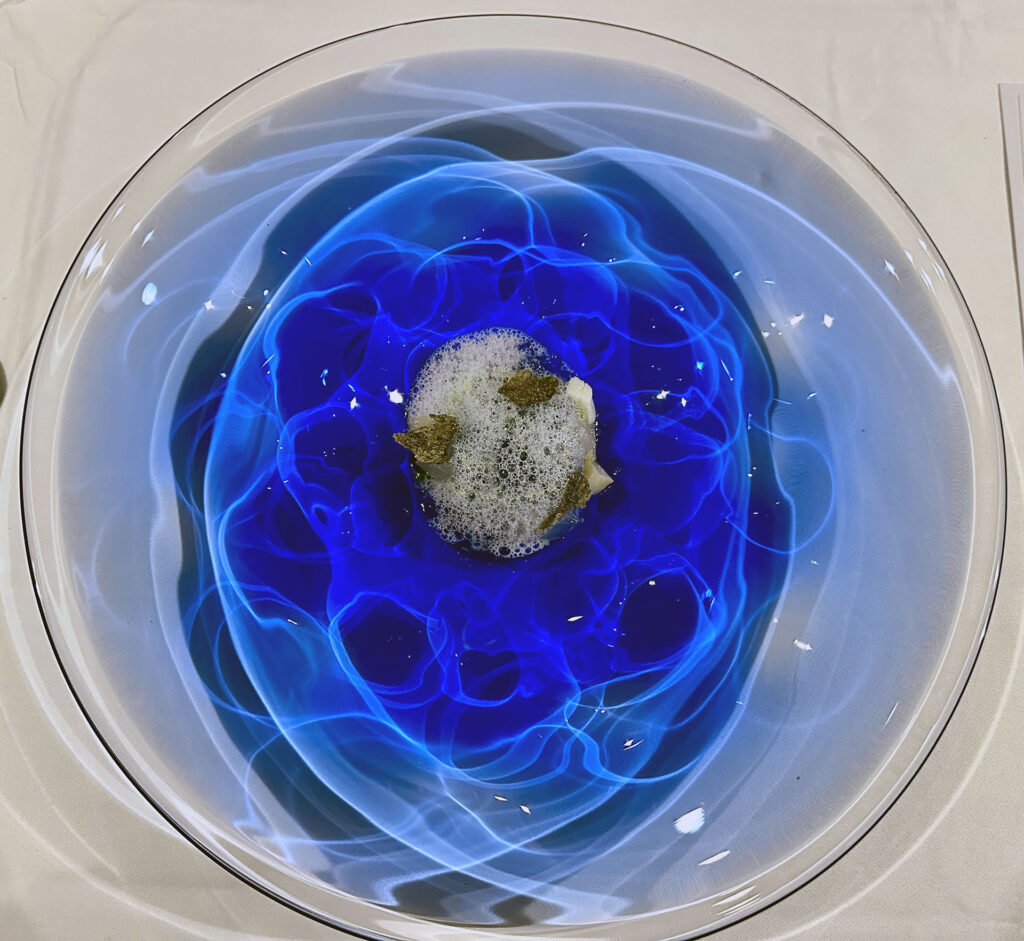 MIKI:この青いガラス皿の海をイメージした料理作品は、イタリア館に展示している隈研吾氏×ムラーノガラスのdieXeシャンデリアの展示の美しい青色からインスパイアされ、アップデートしたお料理だそうです。