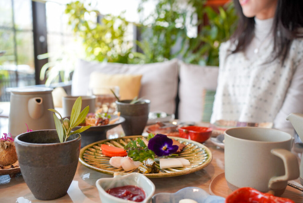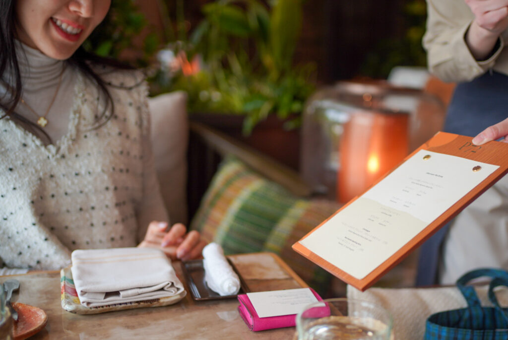1年を72に細分する日本の七十二候から着想を得た「P72」では“季節の素材を生かす” というコンセプトのもと、契約農家から届いた野菜や果物をふんだんに使用した料理を提供。店内やテラスのガーデンではハーブを自社栽培していたり、料理の過程で出る捨てられてしまう野菜の皮などをアップサイクルしていたり…。素材そのものの味を活かし、素材を無駄にしない取り組みも大切にしています。