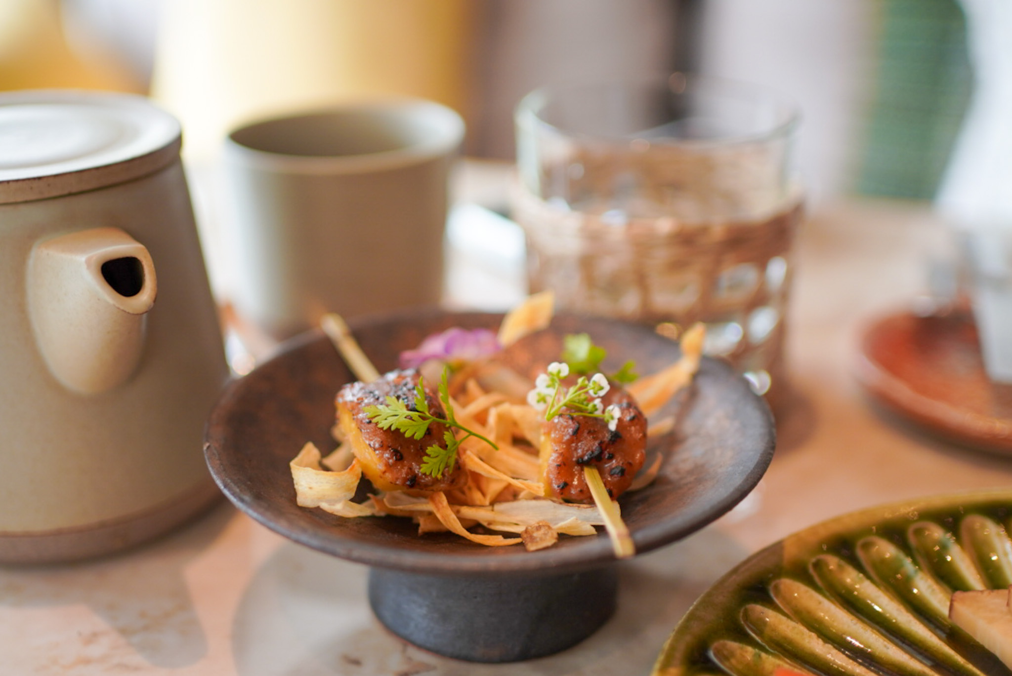 「生麩とクルミ味噌 冬の根菜」は、クルミ味噌の甘味がじわっと広がります。一緒に提供されるごぼうの皮などは本来なら捨てられていたものをアップサイクルで。もちろん一緒においしくいただけます。