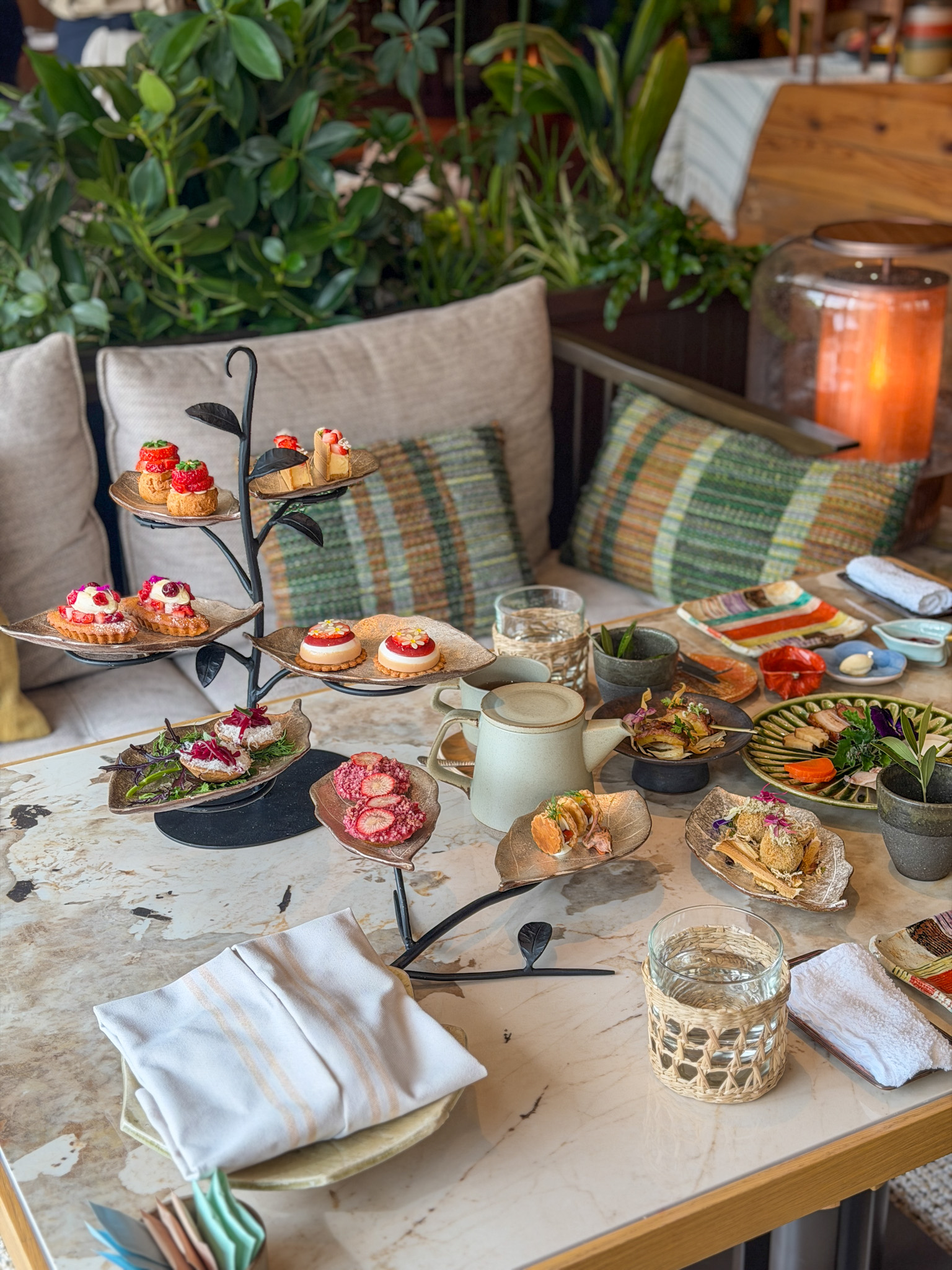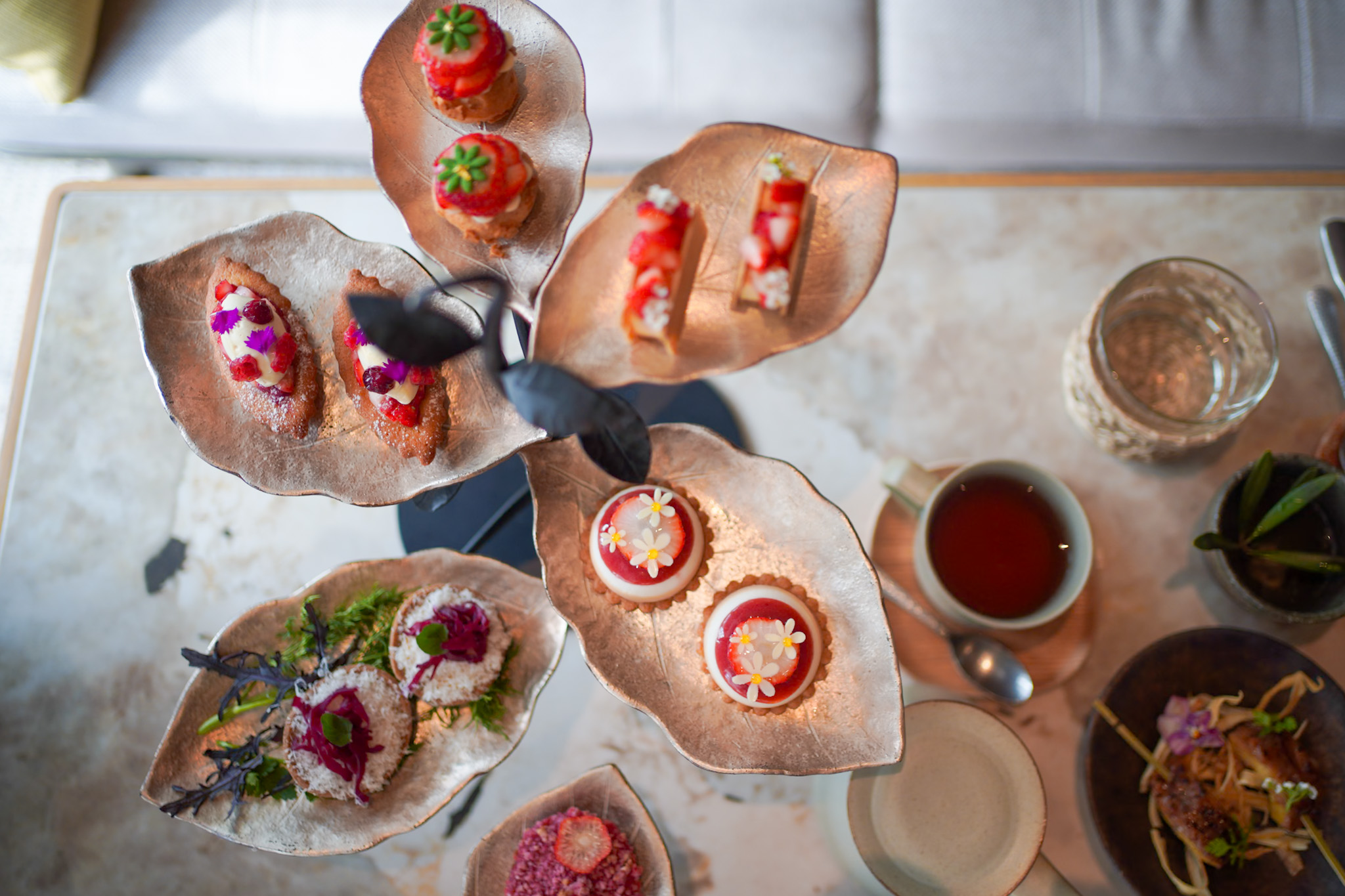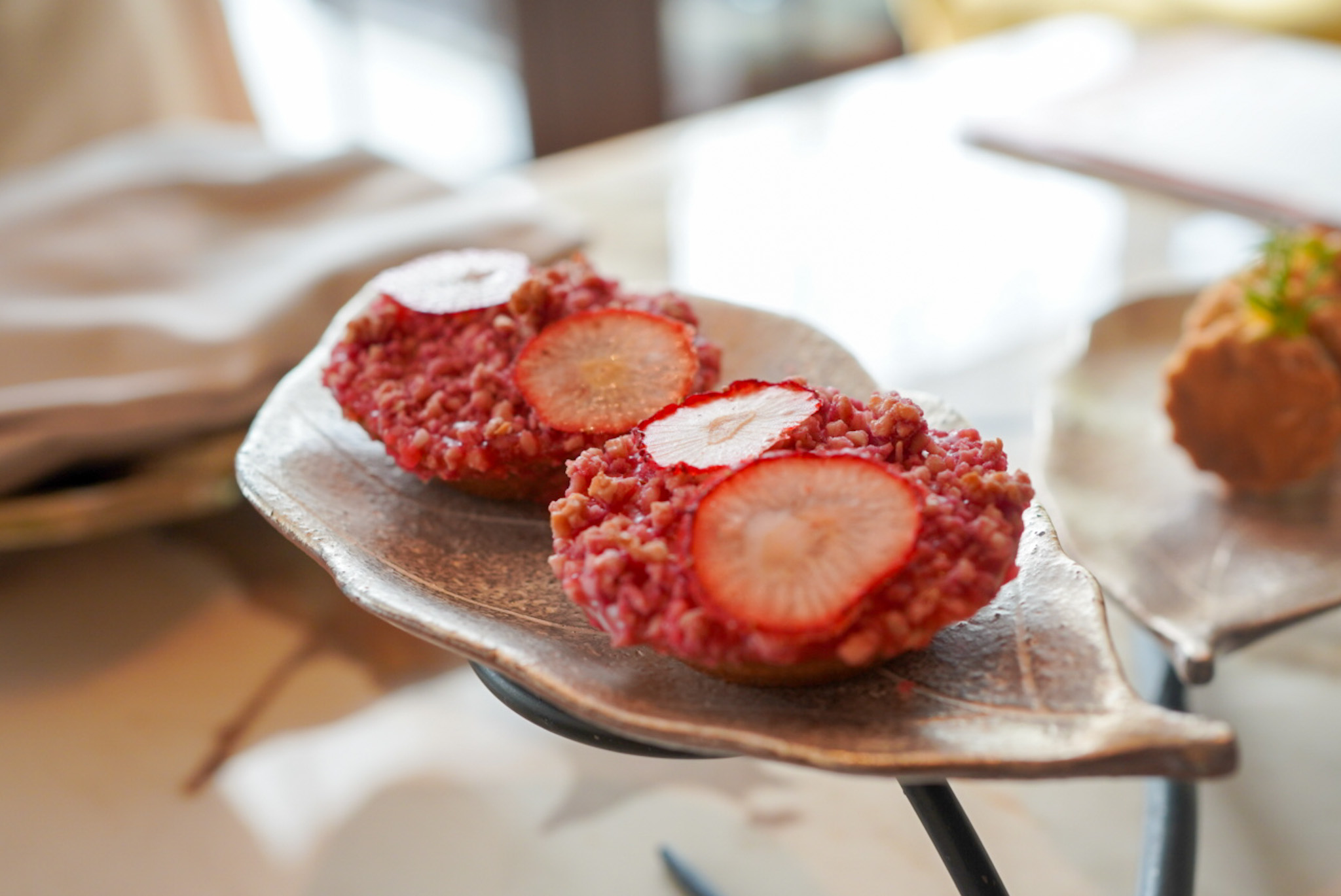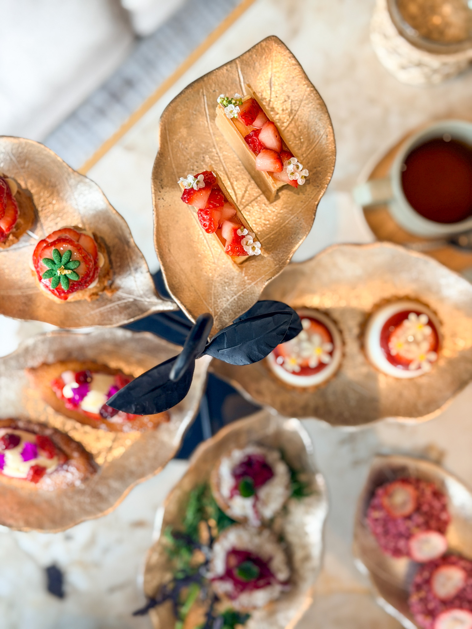 リーフ型の真鍮のお皿も特徴的な「P72」のスタンドには、いちごを使用したさまざまなスイーツ。(一部はセイヴォリー:「野菜パウダーを練り込んだサステナブルキッシュ オーガニック野菜」)フレッシュないちごをふんだんに使用しているので、いちごのみずみずしさを堪能できるスイーツばかりです。