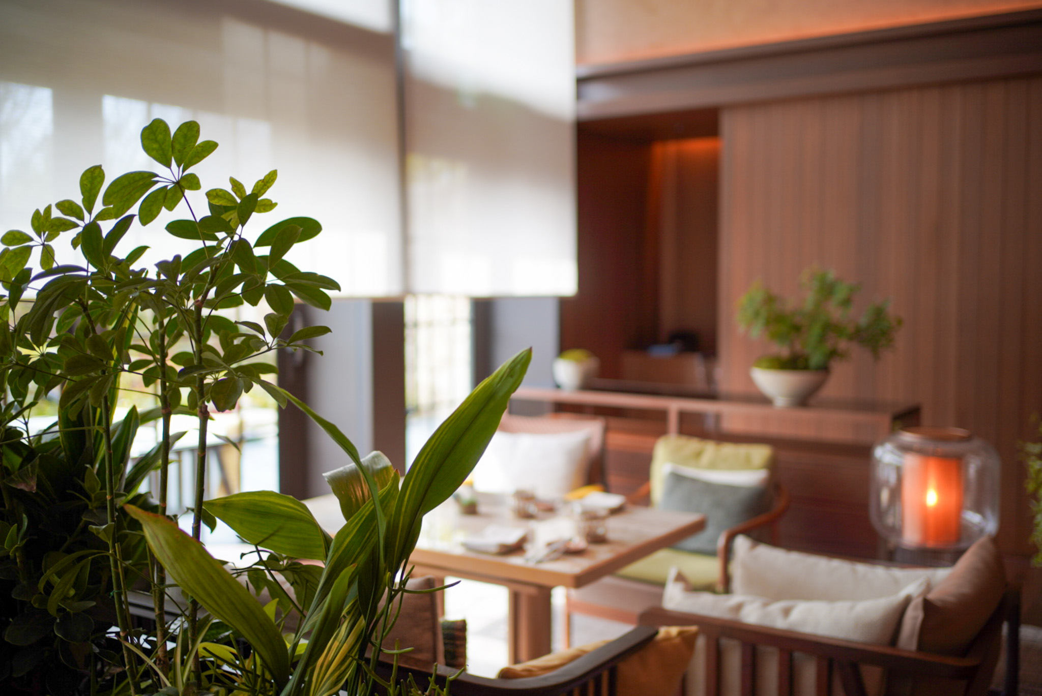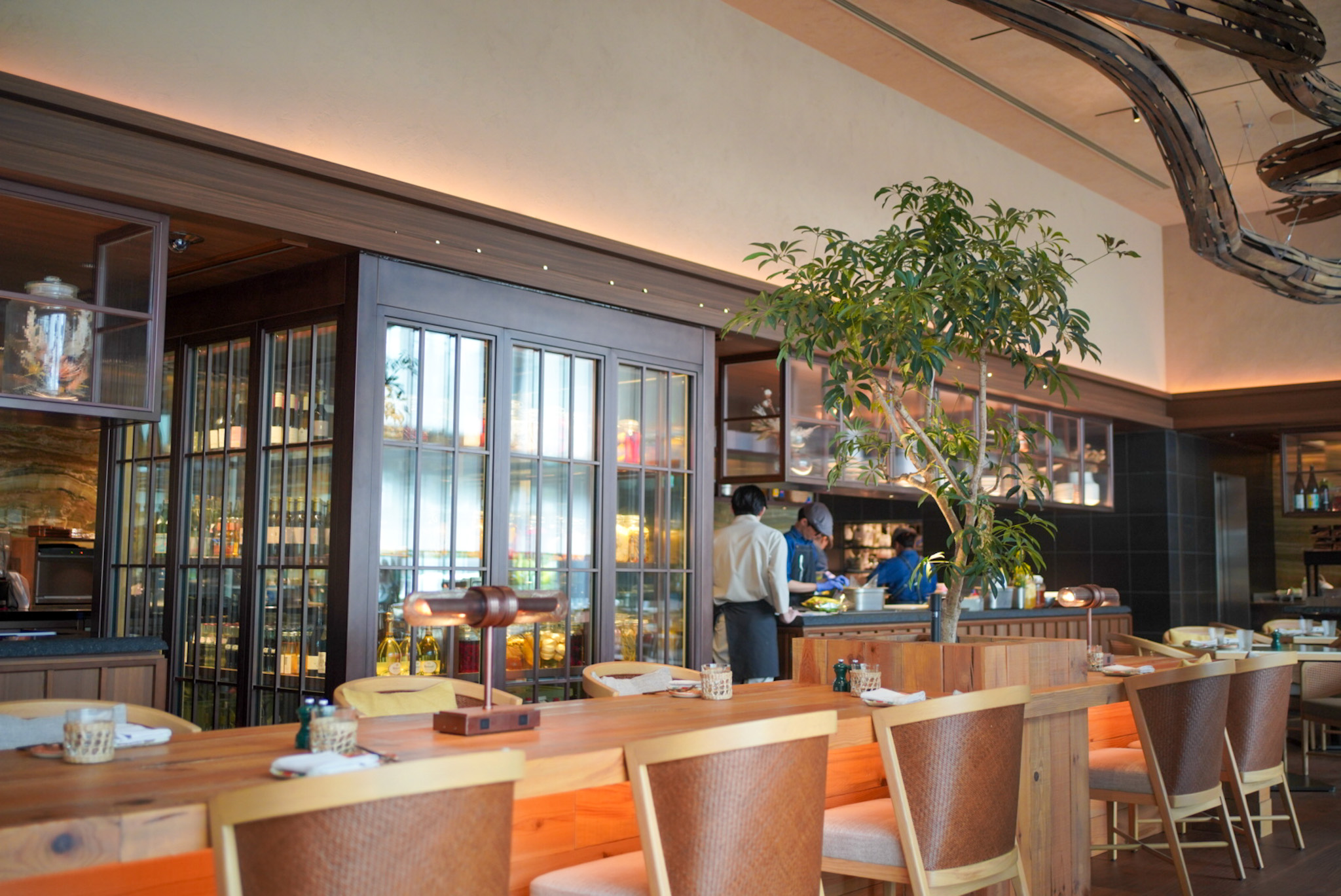 「パティーナ大阪」1階に位置するシグネチャーレストラン「P72」。木の温もりや土の恵みを感じられる空間です。