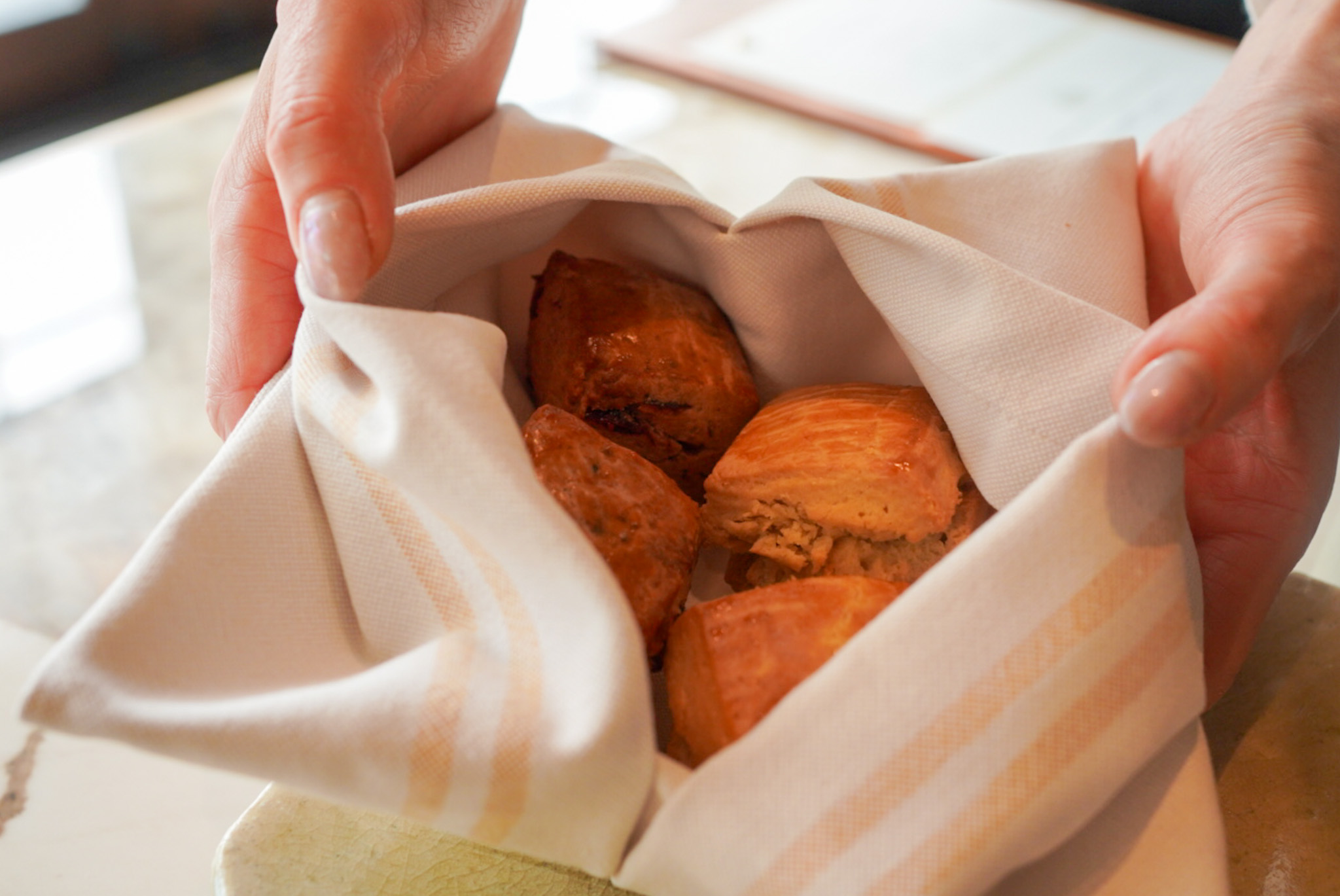 そして、とてもおいしかったのがスコーン!温かなスコーンが提供されるのですが、布にしっかり包まれているので保温効果もバッチリ。外側はさくっとしていて、中はとてもしっとり。黒糖とベリーの2種類をいただけます。