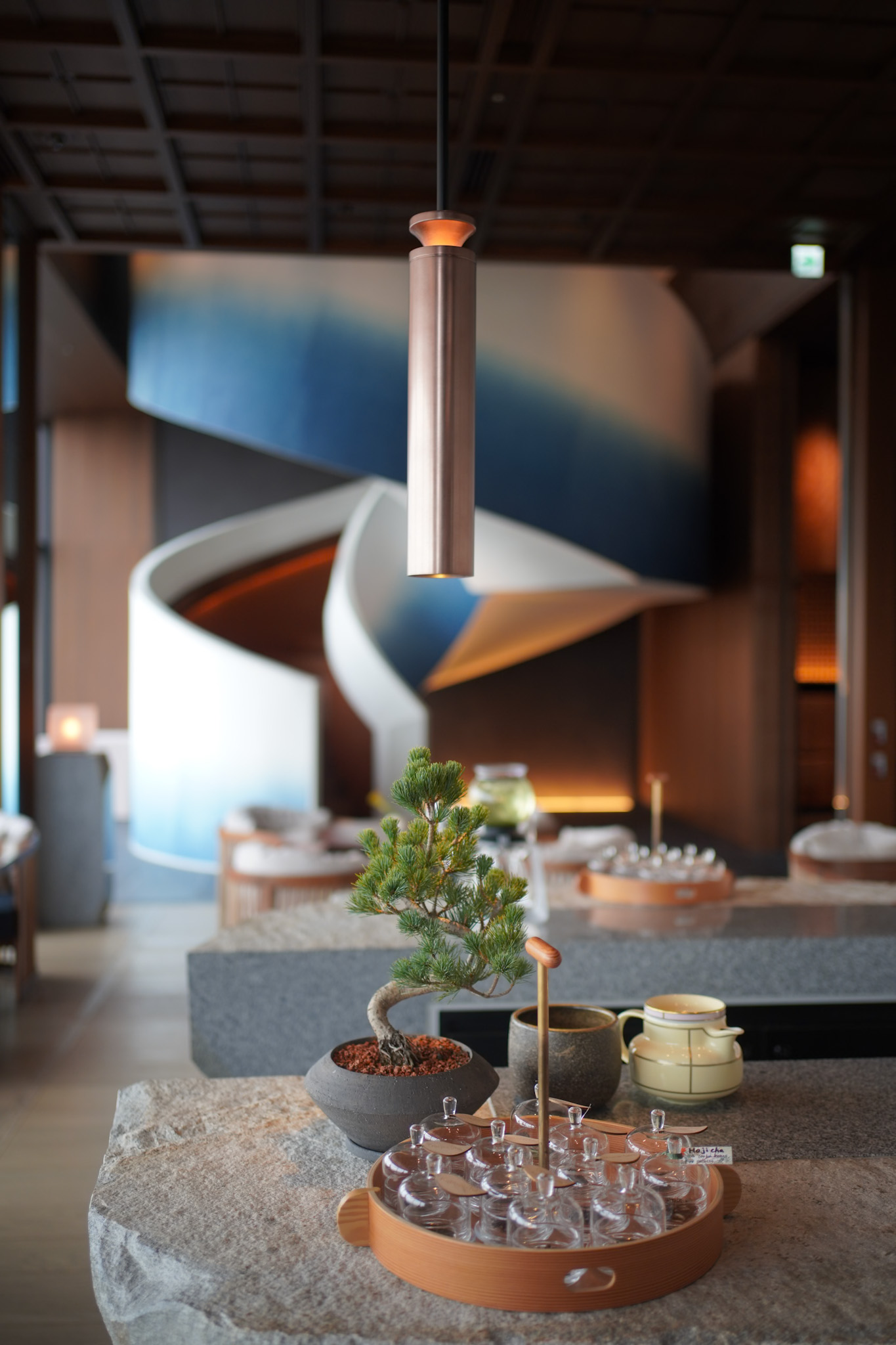 天井に見えるのは、木材を再利用して造られた52メートルのインスタレーション彫刻。根を連想させる形状で、この空間がホテル全体の礎となっているというコンセプトを感じられます。