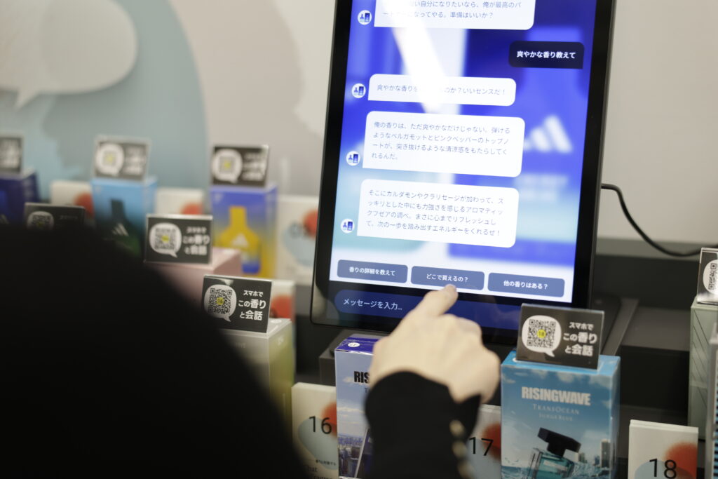 最後は、香りのボトルに話しかけると、AIがその香水のストーリーや印象を語ってくれるという体験。これは香りを”探す”というより、気になった一本を”深く知る”ためのゾーン。対話を通じて自分にとっての心地よさやしっくり来る理由が整理されていく感覚があり、ただ嗅ぐだけでは得られなかった納得感を味わうことができました。