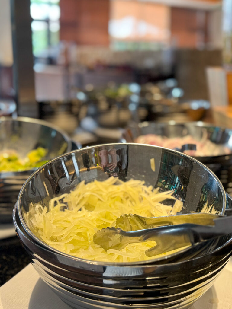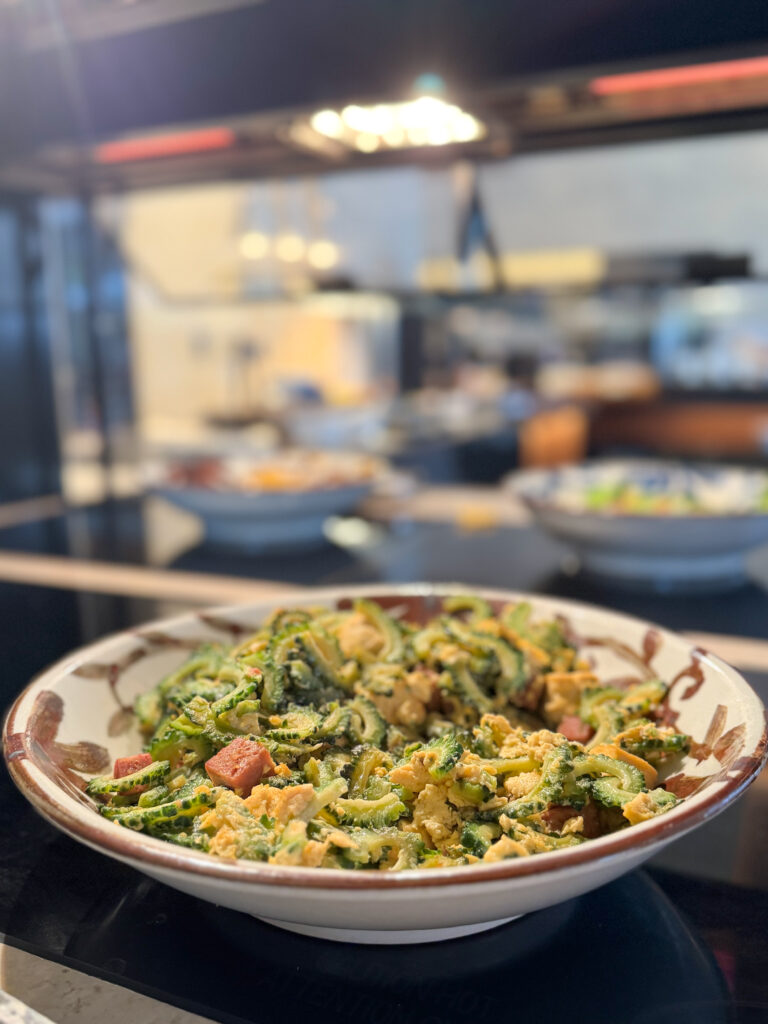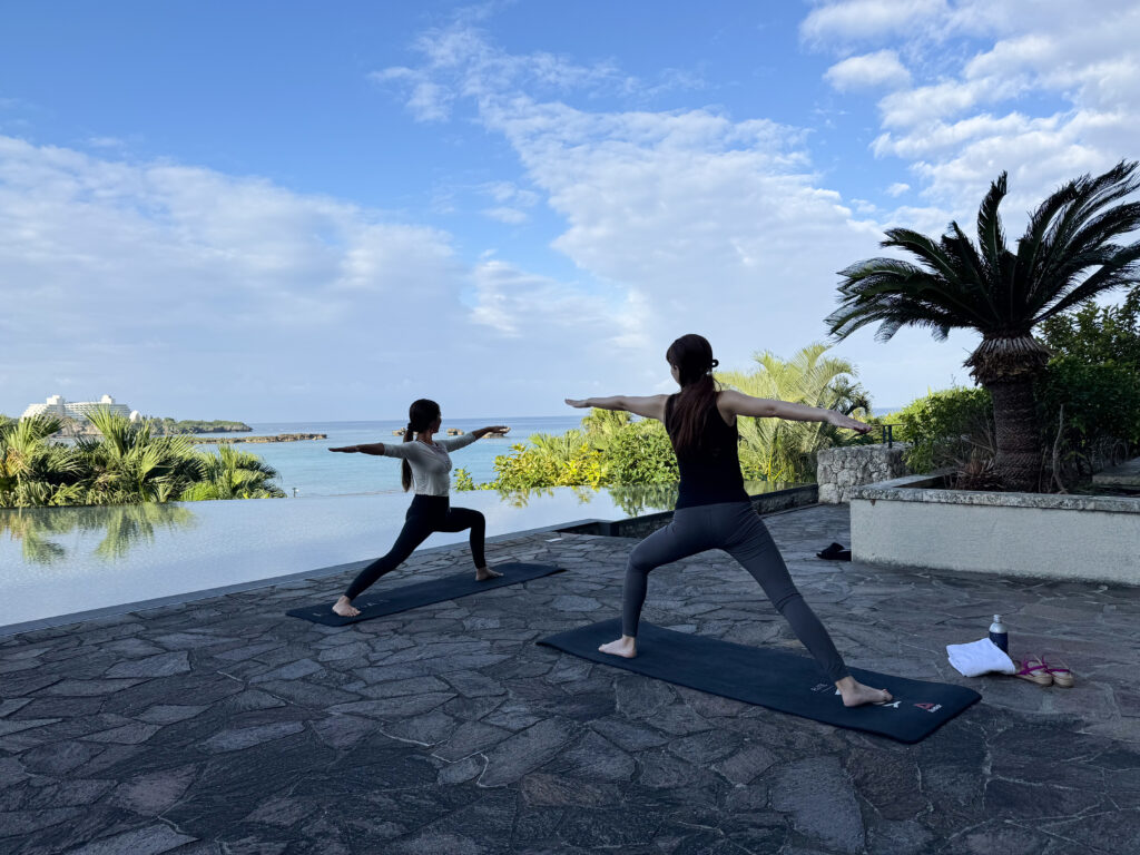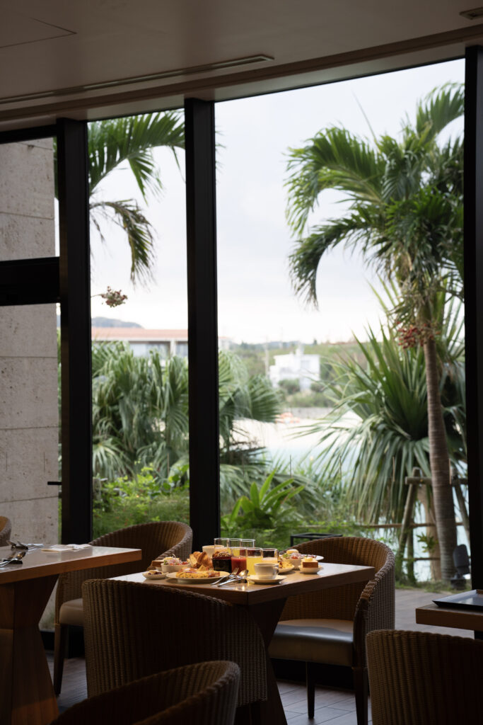 朝はプールサイドやレストランでのビュッフェ形式の朝食で、沖縄らしい食材を使った料理を味わえます。ヨガで体をぐーんと気持ちよく伸ばした後なので、お腹もペコペコ! 窓際の席で、夜とは異なる穏やかな光の中で味わう食事も最高。