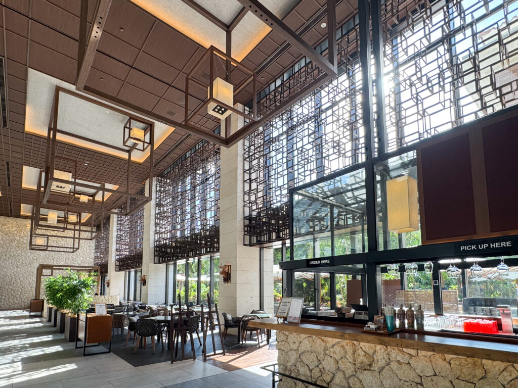 ホテルに一歩入ると、モダンで開放的なロビーが広がります。この日はお天気がよく、チェックイン時にちょうど木漏れ日が差し込み、ブラウンやベージュを基調とした温かみのある空間が、さらに神々しい雰囲気に!