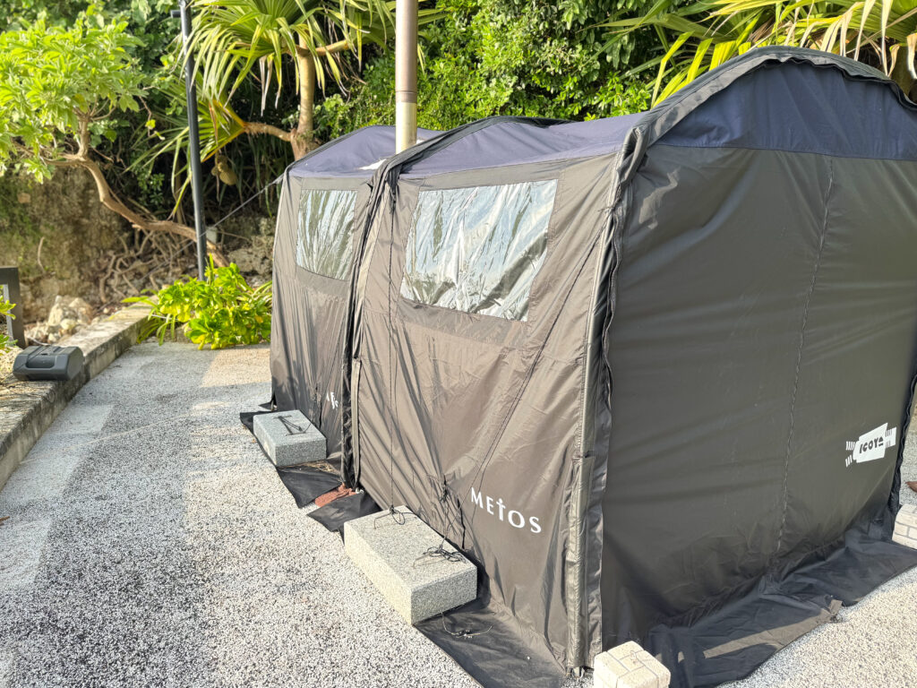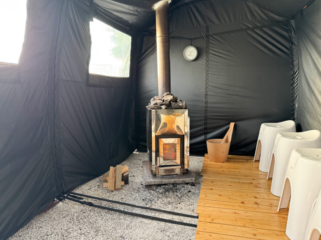夕食前にぜひ体験していただきたいのが、フィンランド式の「テントサウナととのい体験」。薪ストーブの温もりに包まれながら“ととのい”を味わえるウェルネスアクティビティで、沖縄で本格的なテントサウナ体験ができる場所は珍しいそう。