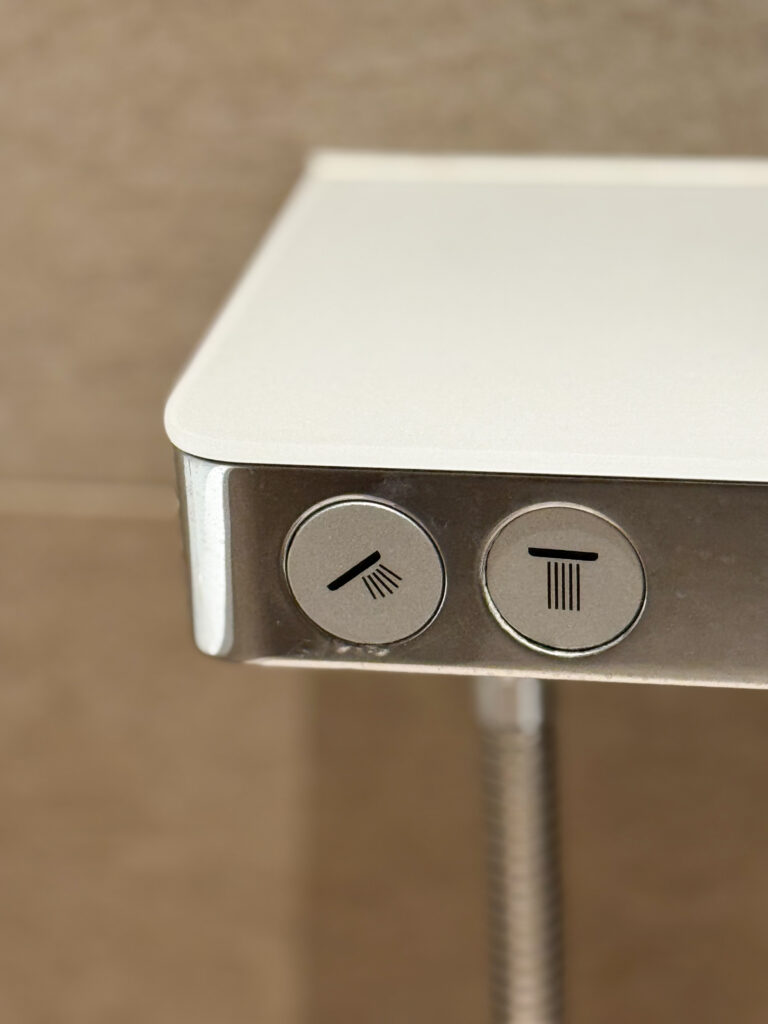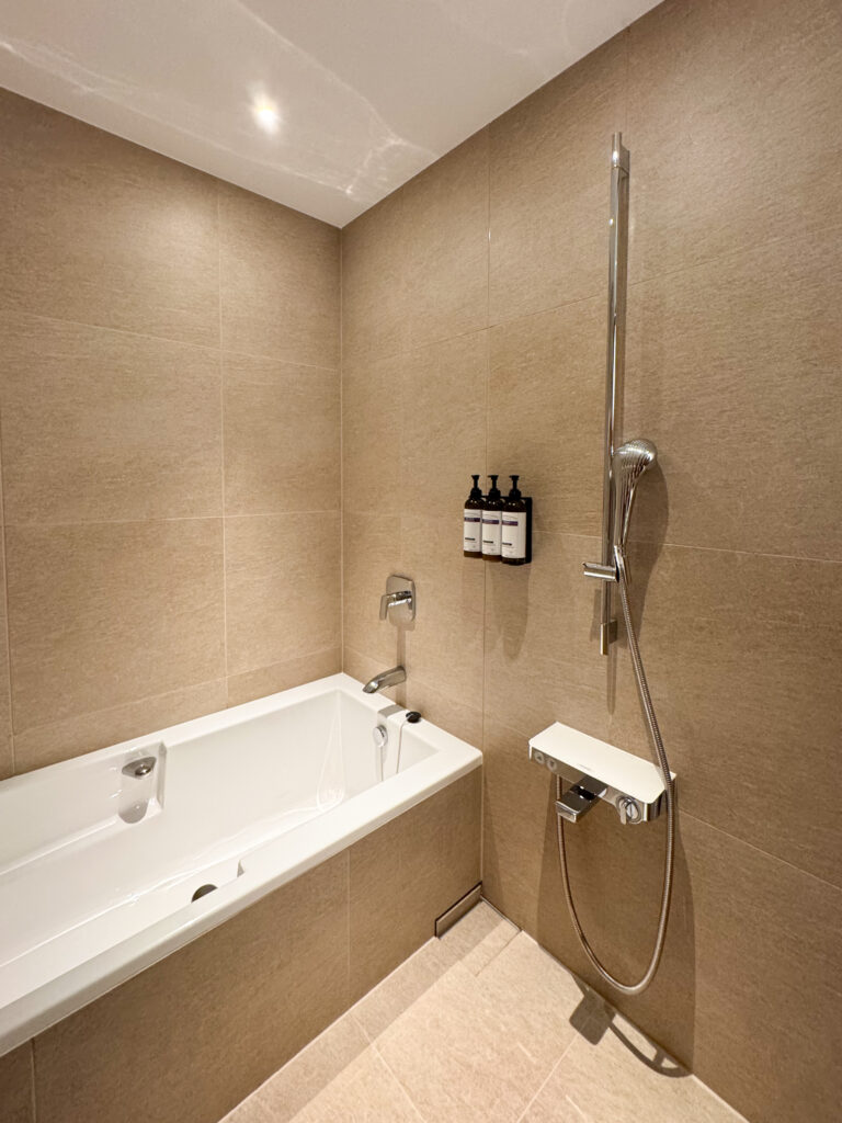 落ち着いた照明のバスルームは、洗い場もバスタブも広々とした造りで、使いやすさに優れています。特にハンディシャワーとレインシャワーがボタンひとつで切り替えられ、ハンディシャワーは「リファ(ReFa)」を採用。水流タイプも簡単に切り替えられ、用途や気分に合わせて選びやすい仕様。