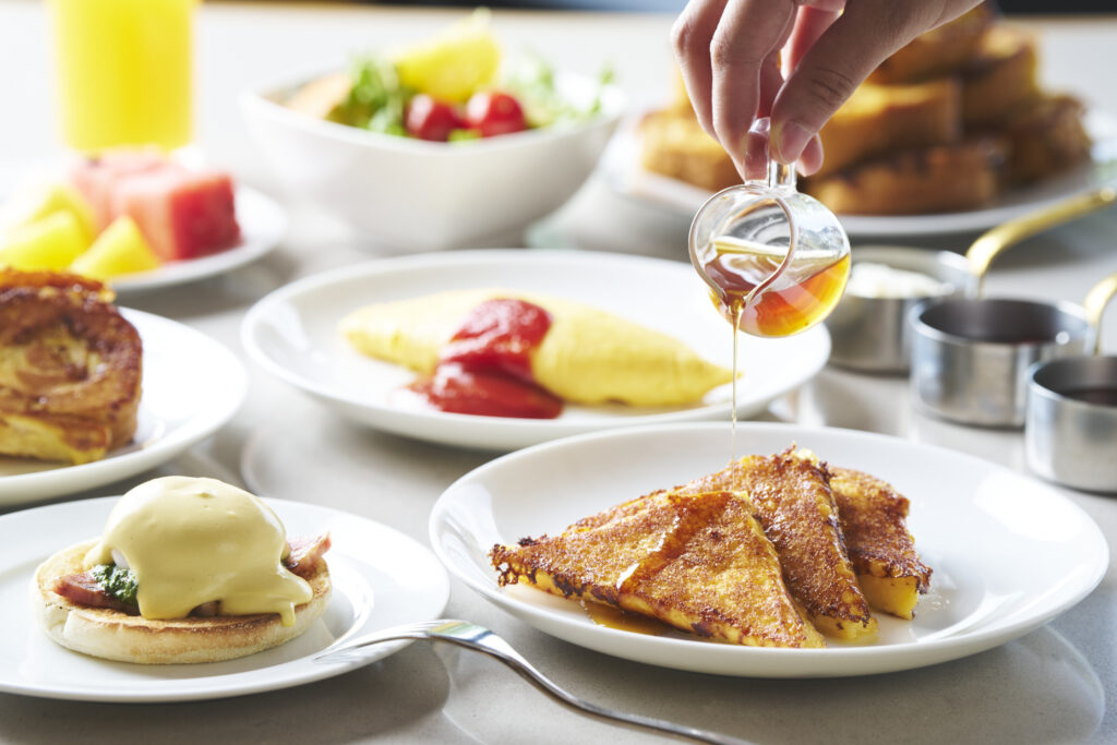 バラエティ豊かなフードのラインナップに、どれからいただこうか迷ってしまいます。シェフやサーバーの方に、おすすめ料理を伺うと「フレンチトーストはぜひ!」とのこと。噂通りの、外はカリカリ香ばしく、中はもっちりジューシーなお味に納得。一晩かけてしっかりと卵液にひたすことで、あっという間に口の中でとろけ、消えてしまうほどのなめらかさを実現できているとか!