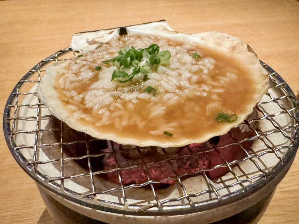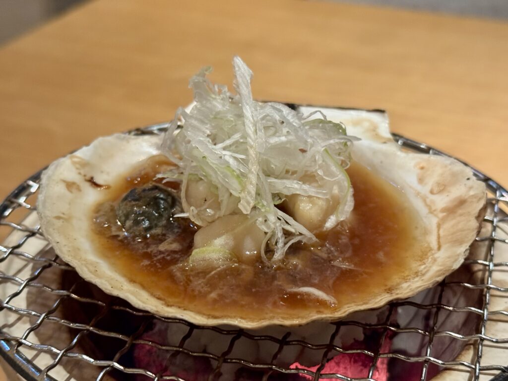 コース料理とは別に、あまりにも美味しそうだった炉端料理長おすすめの「殻付き帆立貝炭火焼き-追い飯付き(¥2,530+サービス料)」もいただきました。ホタテのジューシーな香ばしさを味わえるのはもちろん、貝殻に残ったお出汁にご飯とバターを入れて、リゾットまで堪能できる贅沢さ! 2名でシェアできる量なので、コース料理に1品追加もおすすめです。